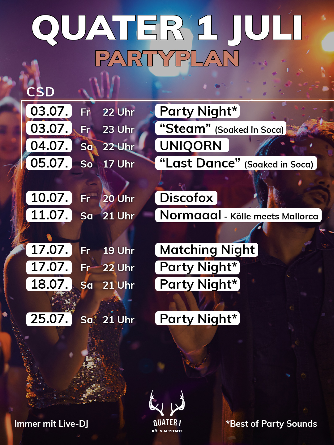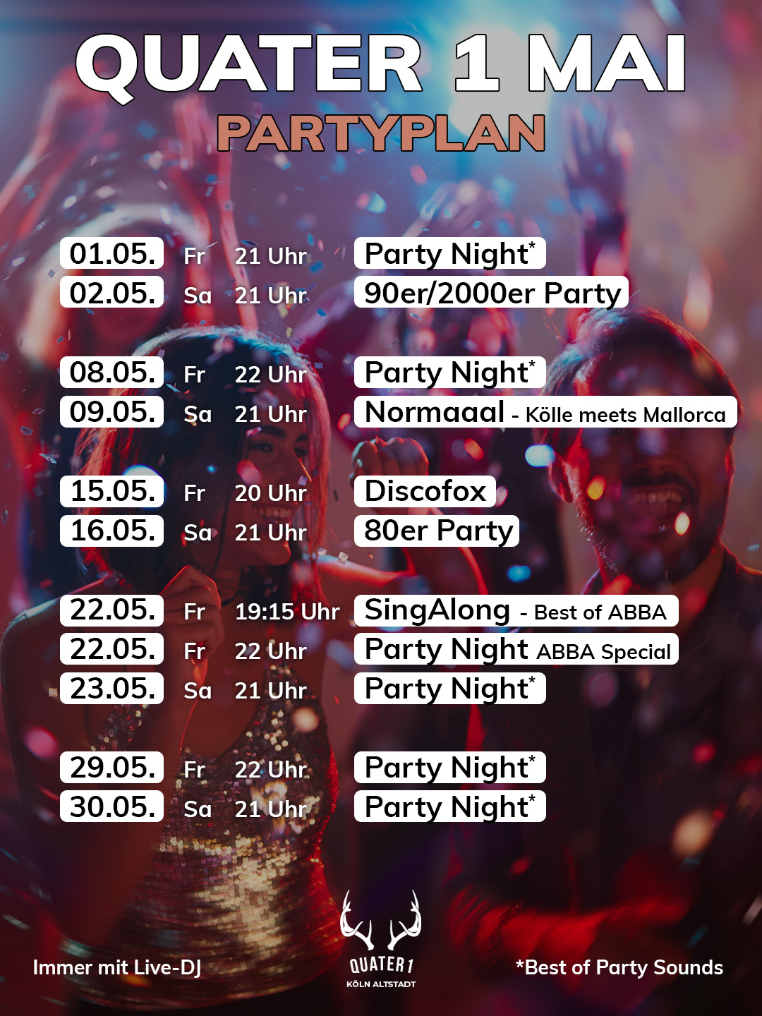 Du suchst nicht einfach nur einen Club, sondern ein Zuhause für deine Wochenend-Nächte? Im QUATER 1 erwartet dich genau das: Eine einzigartige Mischung aus urbanem Club-Vibe und der herzlichen Gemütlichkeit unserer Alm Lounge – mitten im Herzen der Kölner Altstadt.