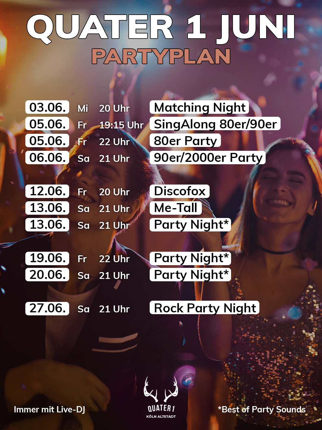 Erlebe unvergessliche Nächte im Herzen von Köln. Mit wechselnden DJs und exklusiven Party-Konzepten sorgen wir für den perfekten Mix. Egal, ob bei unseren hauseigenen Events oder speziellen Themenevents: